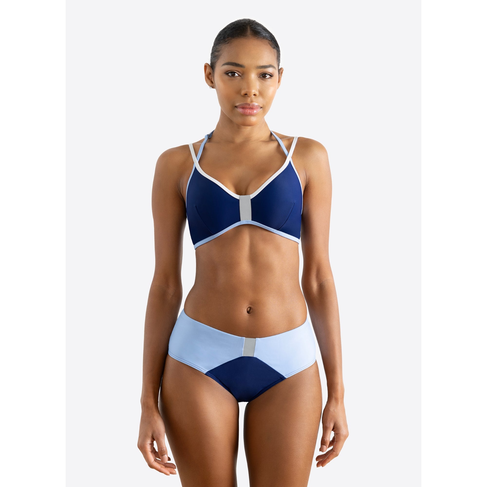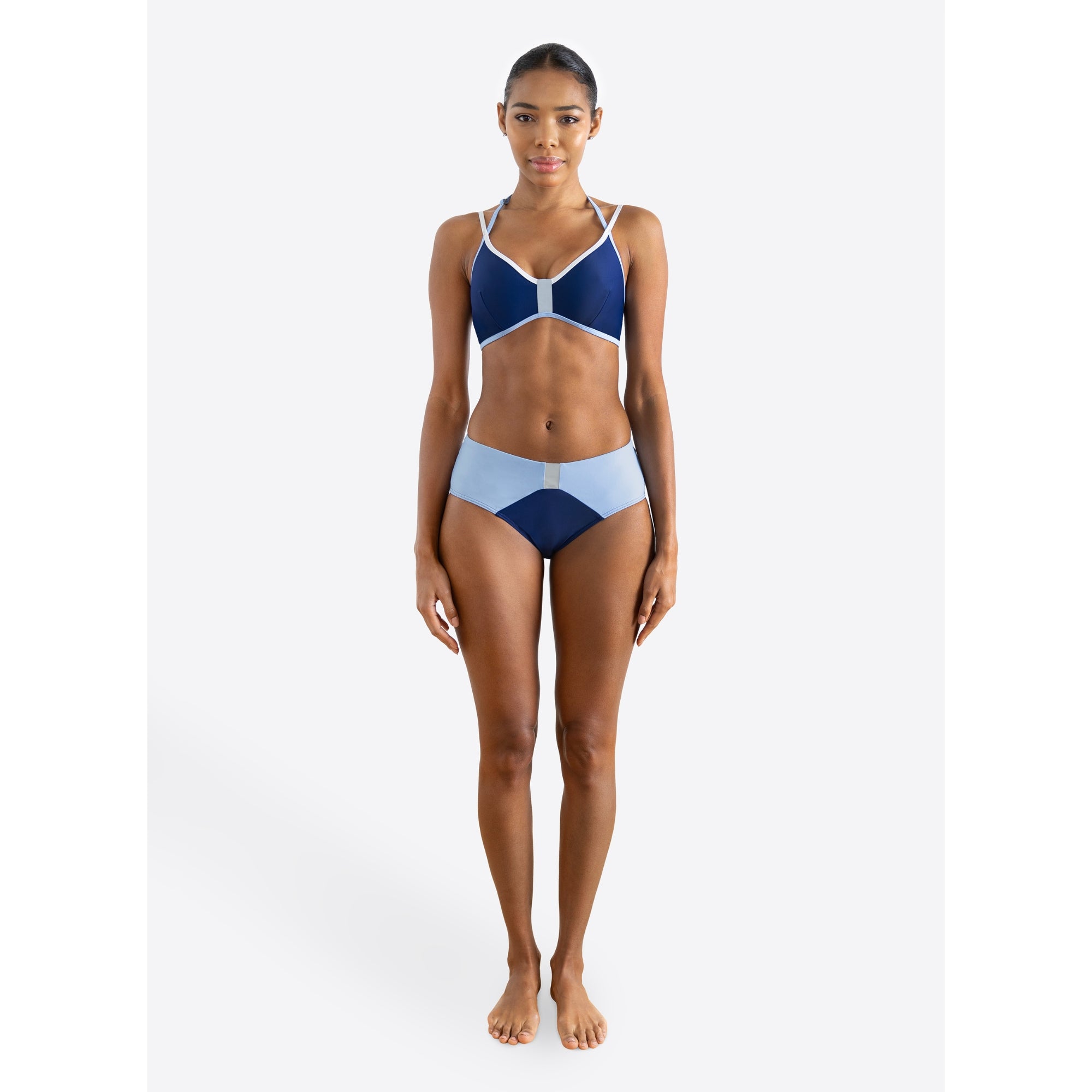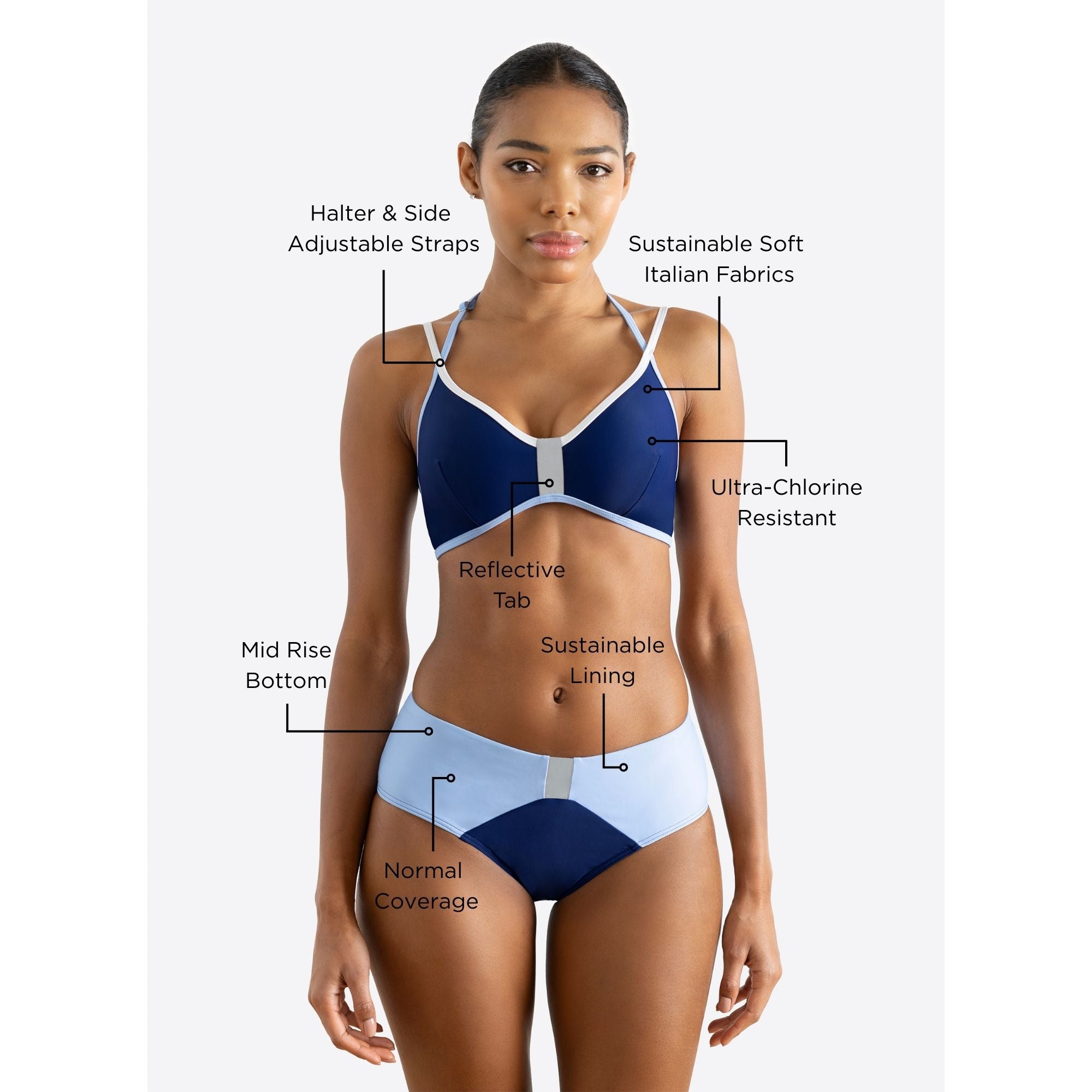 Mid Rise Bottom: Provides more coverage across the hips for a flattering, supportive fit.